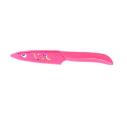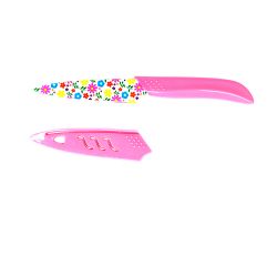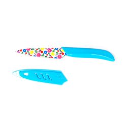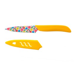 "Cuchillo pequeño con navaja en diseño de flores. Será un utensilio seguro para tu cocina ya que cuenta con una funda para la navaja que te ayudará a evitar accidentes, con el podrás cortar fruta o alimentos pequeños. Además su diseño de flores le dará estilo a tu cocina. Colores: azul, rosa o amarillo. Materiales: mango de plástico y navaja de acero inoxidable. Medidas: 20 cm largo"
