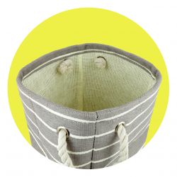 Mantén tus cosas organizadas con este cesto de almacenamiento cilíndrico; guarda todo gracias a su gran espacio interior y material súper resistente, además, de que por ser un producto natural y ecológico, podremos asegurarte que cuidaremos al medio ambiente. Material: papel y algodón. Color: Gris con franjas blancas. Medidas: 28cm Diam x 35cm al